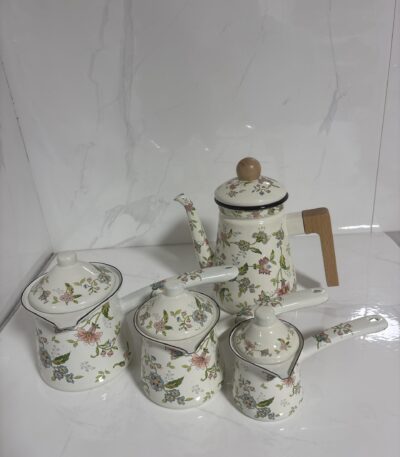 סט קומקום וקנקן אמייל עם ידית עץ – נפח 1 ליטר