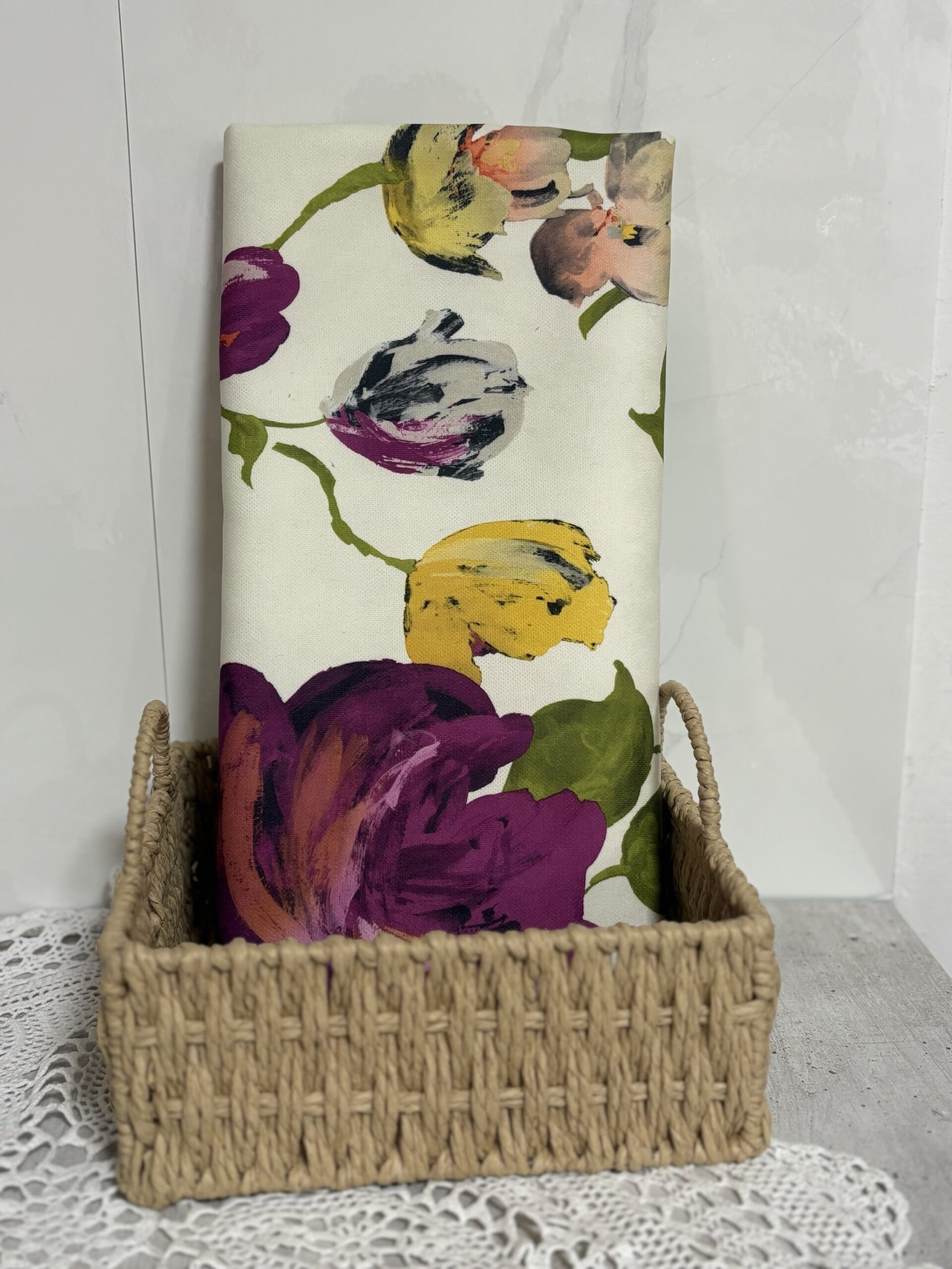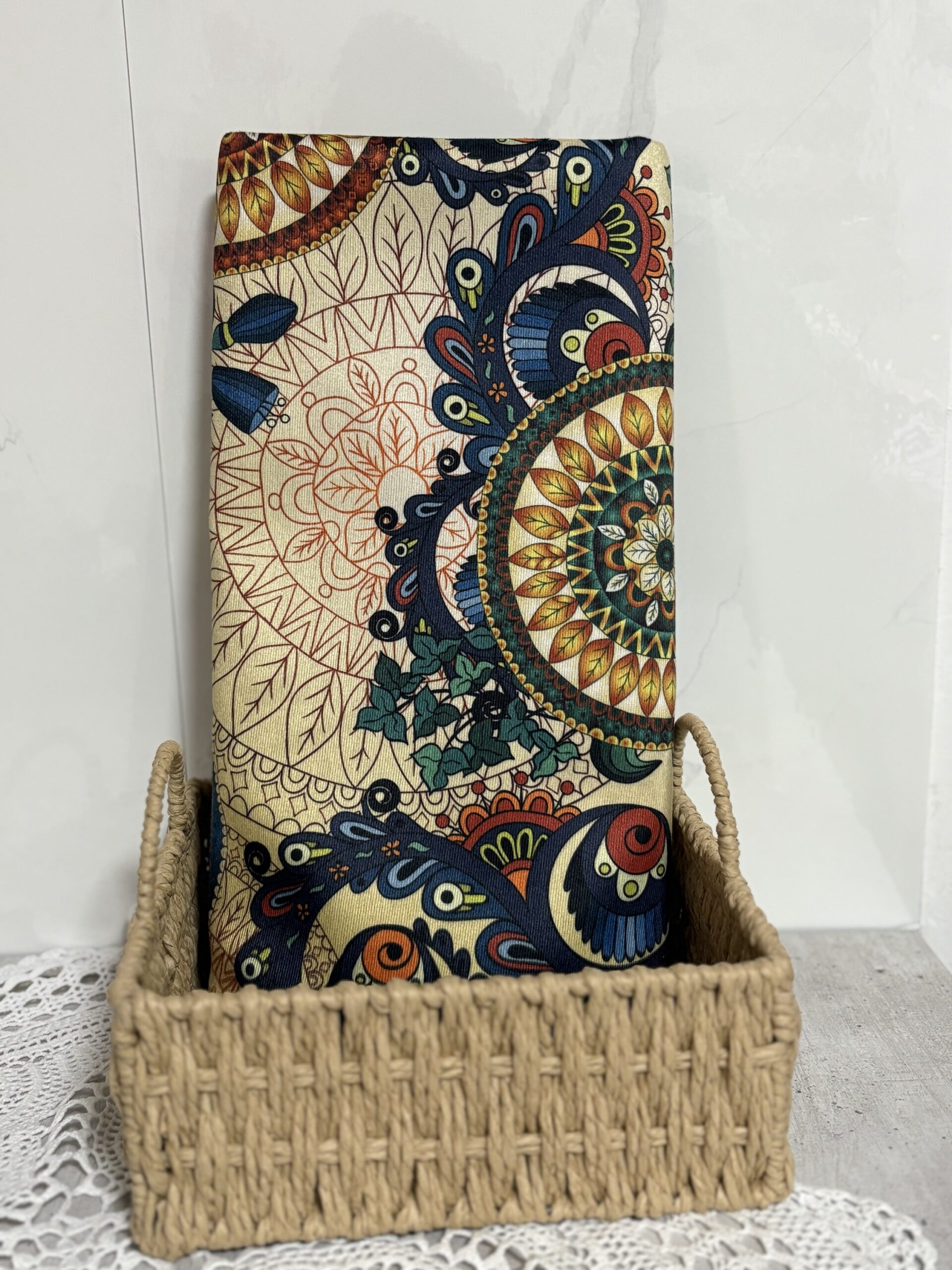 מפת רצפה נגד ספיגת מים עם גימור עור הפוך, מעוטר בדוגמות פרחוניות. המזרן מגיע בחמש דוגמאות שונות, עם אורך של 1.5 מטר ורוחב של 1.2 מטר