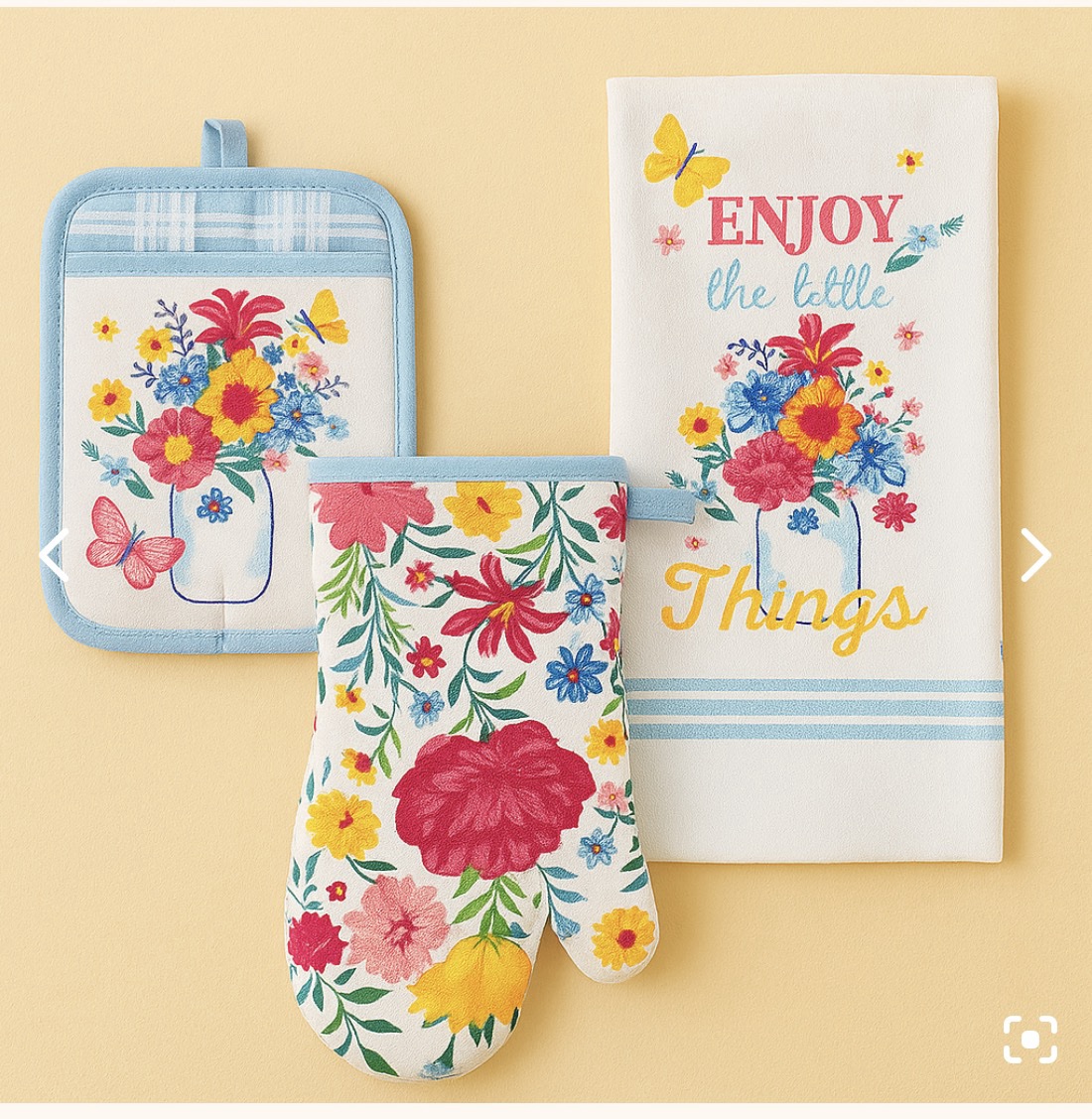 זהו סט מטבח מעוצב מבית The Pioneer Woman שמוסיף מראה כפרי ופרחוני למטבח שלך. הדוגמה והעיצוב שלו כוללים פרחים צבעוניים בצבעים מרהיבים שמכניסים תחושת חום ונעימות לחלל המטבח