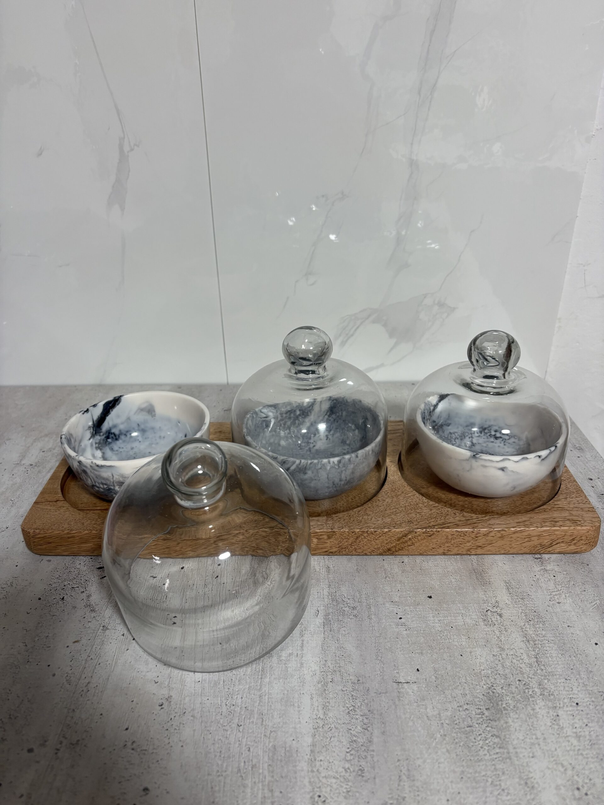 סט צלחות אירוח מורכב משלוש קופסאות זכוכית עם מכסה על מגש עץ – מושלם להגשת קינוחים, עוגיות, פירות יבשים ודבלים. עיצוב אלגנטי ושימושי לכל אירוח