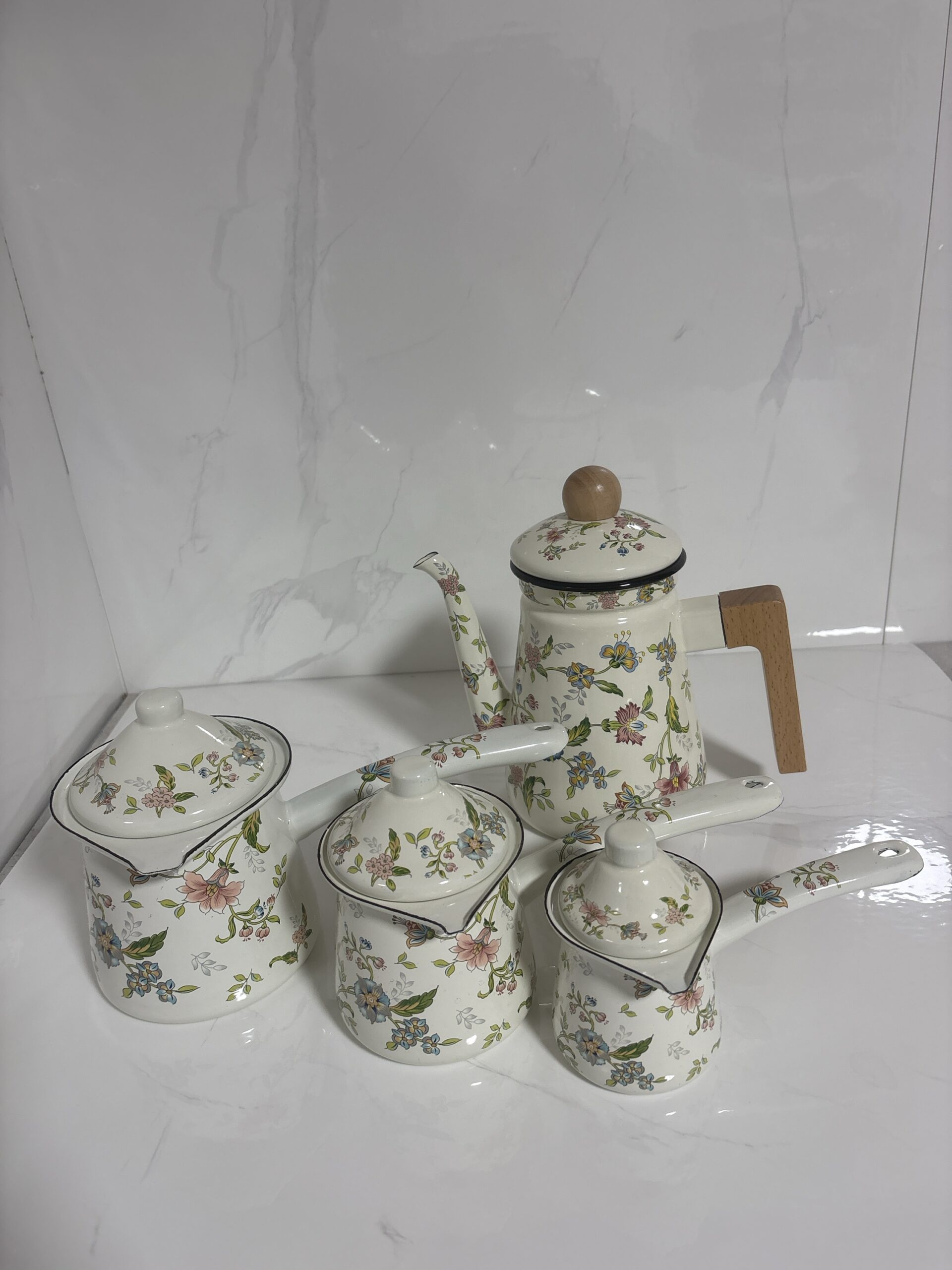סט קומקום וקנקן אמייל בעיצוב מתואם ומראה וינטג’ עדין. הקנקן מגיע עם ידית עץ נוחה ואלגנטית, בנפח של 1 ליטר – אידיאלי להכנת תה או קפה בכמות מושלמת.