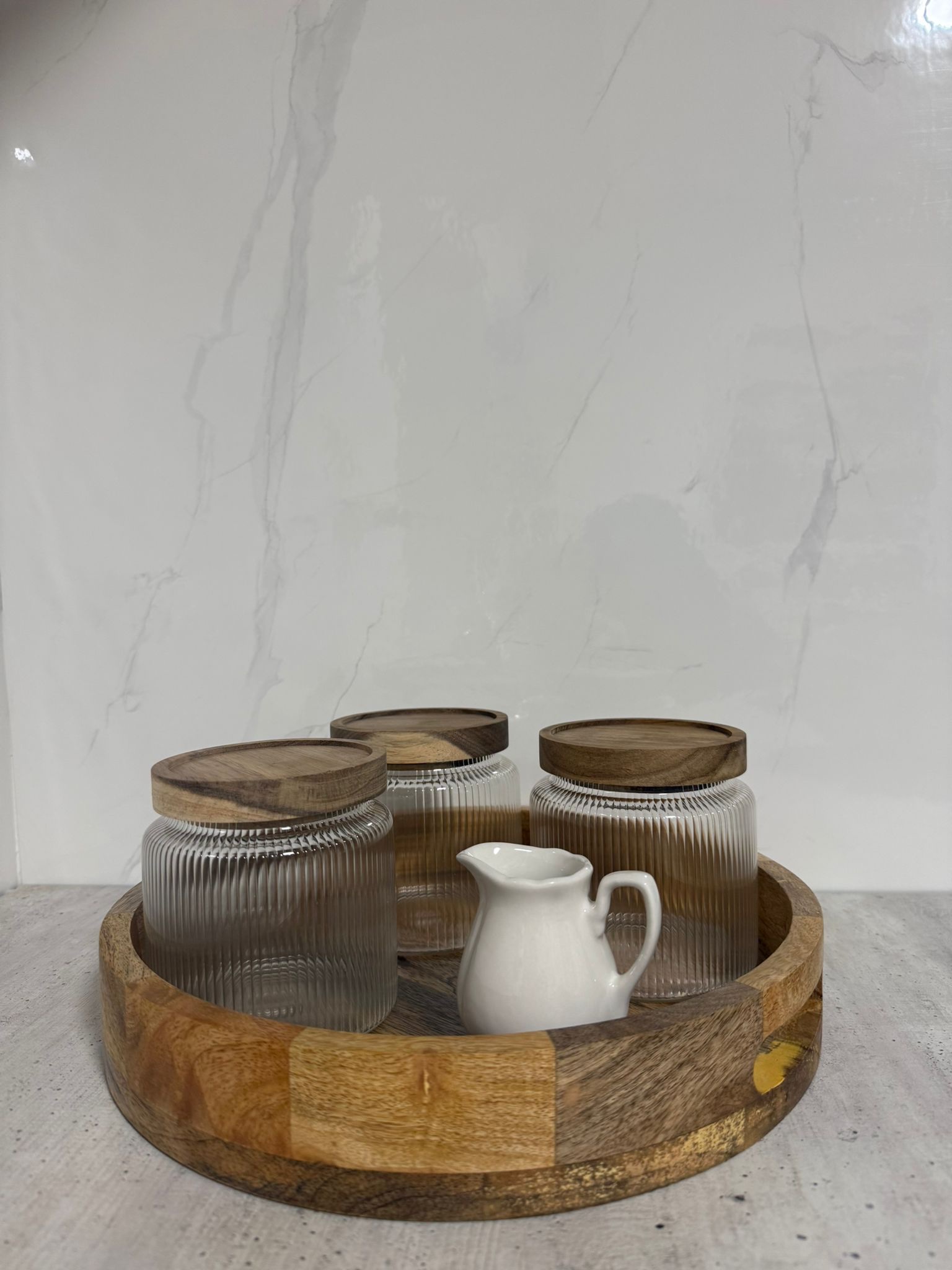 כולל מגש עגול מעץ במבוק, עמיד למים ואינו סופג לחות, מספק ארגון מסודר ואסתטי במטבח
