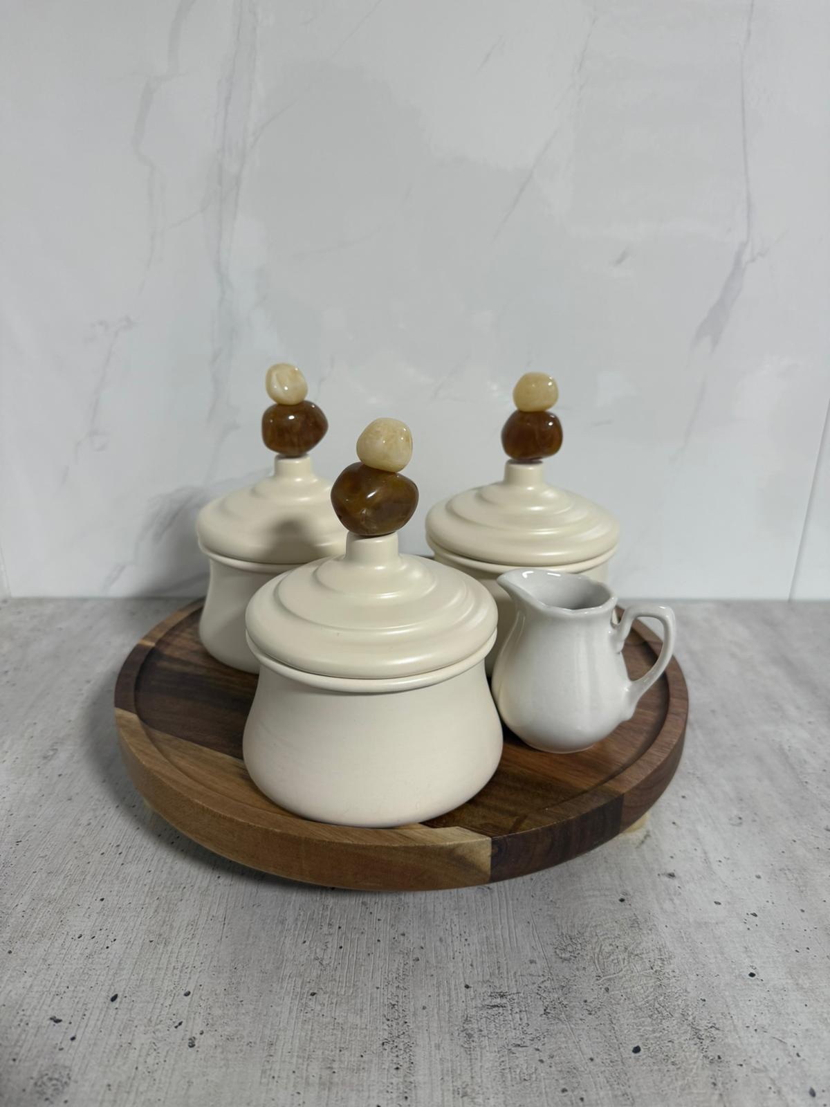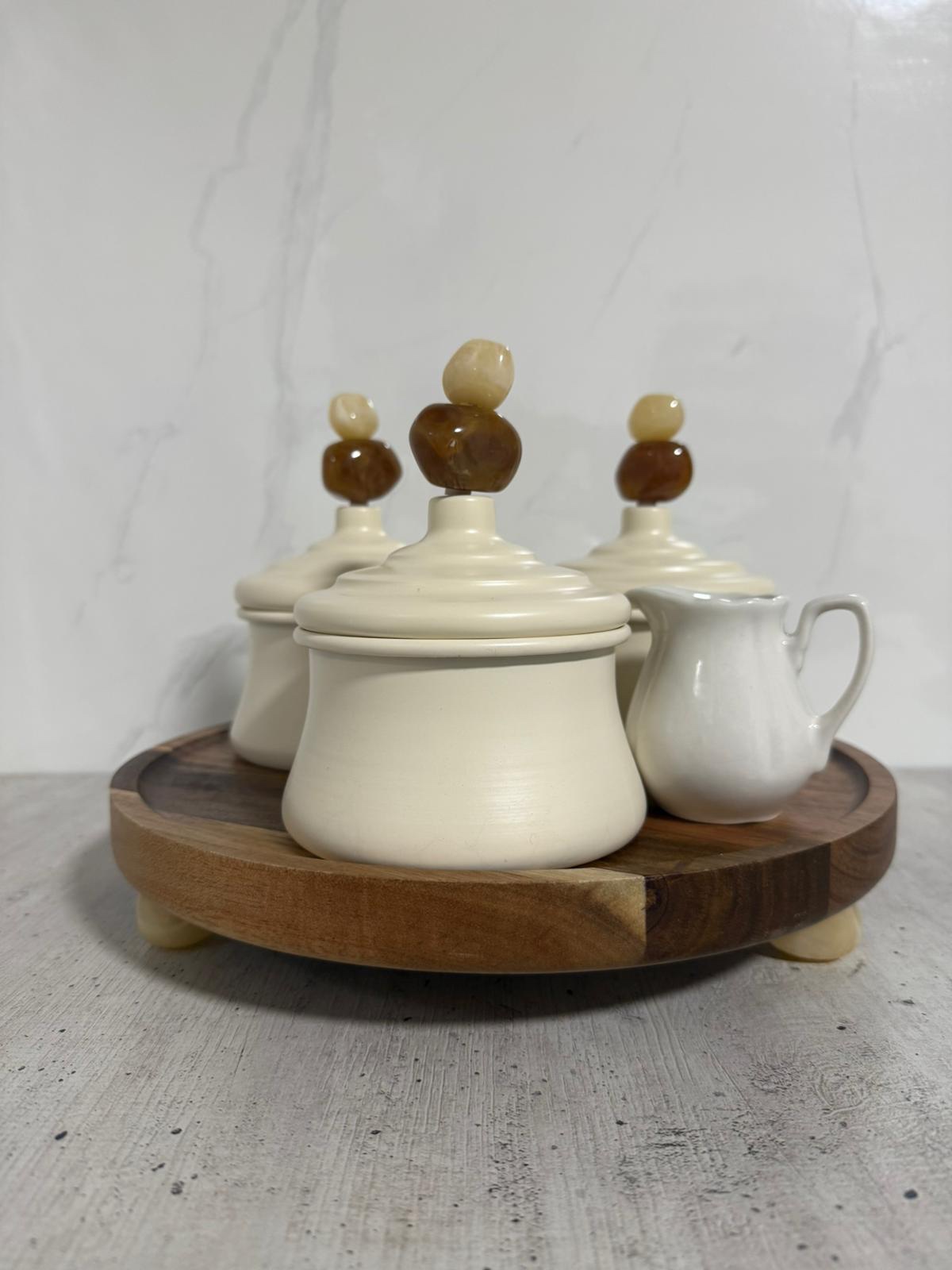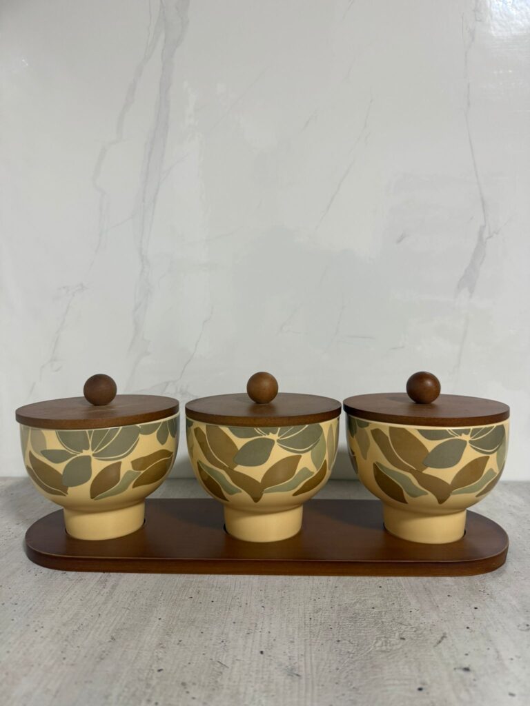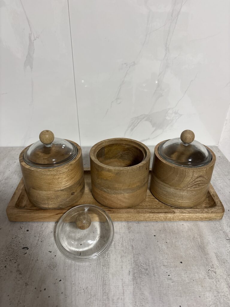סט הכולל שלוש קופסאות מתכת בצבע לבן, על מגש עגול מעץ במבוק.