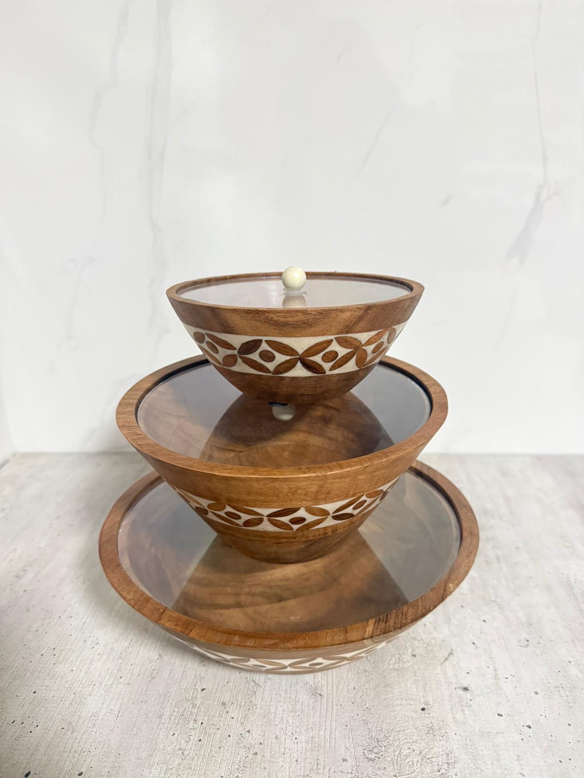 סט שלוש קערות איכותיות לאכילה או לסלט, כל אחת עם מכסה פלסטיק שקוף.