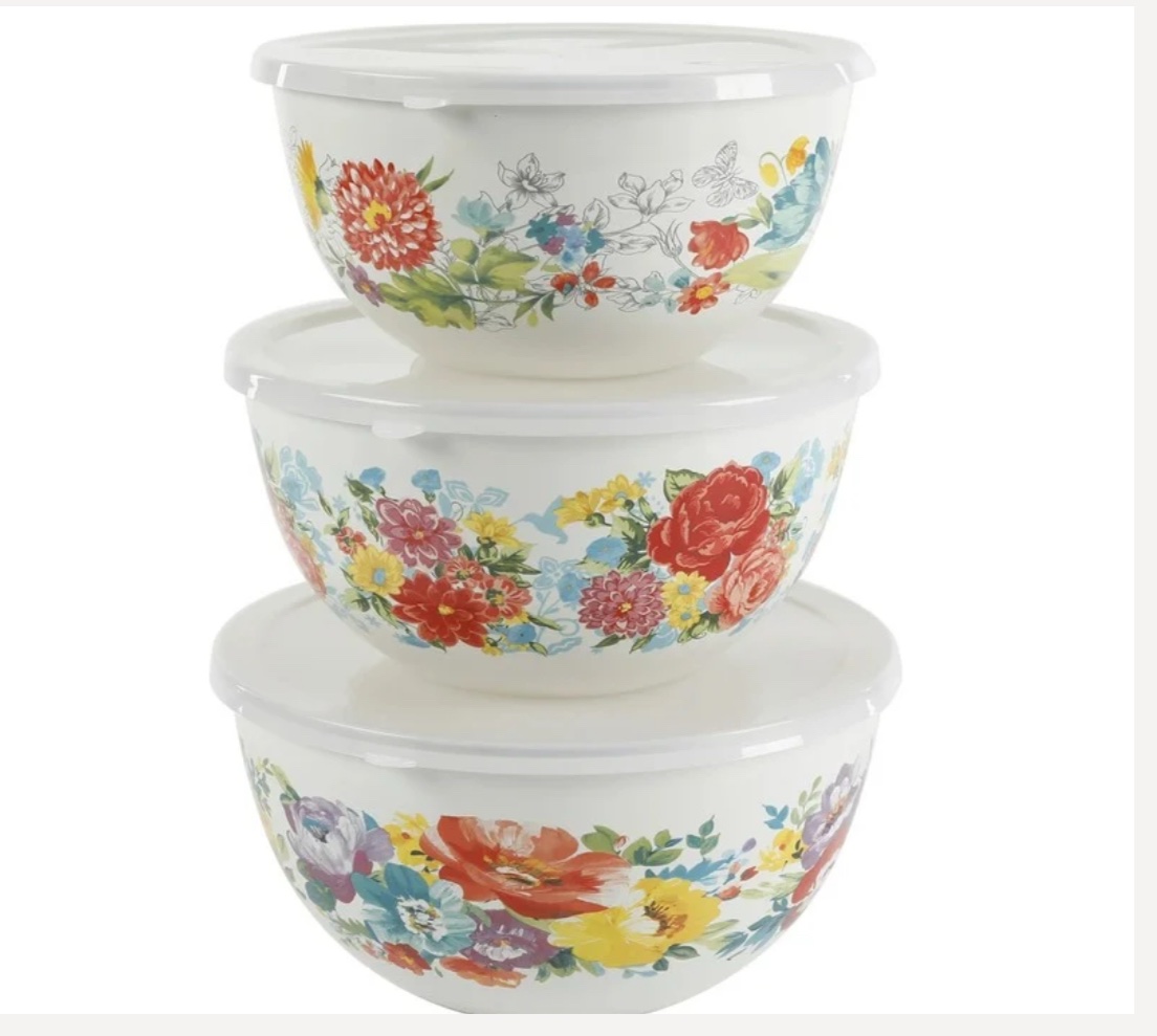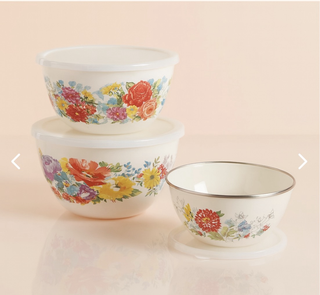 סט מהמם של 3 קערות אמייל בעיצוב קלאסי ונקי, כולל מכסים תואמים לשמירה על טריות המזון.
