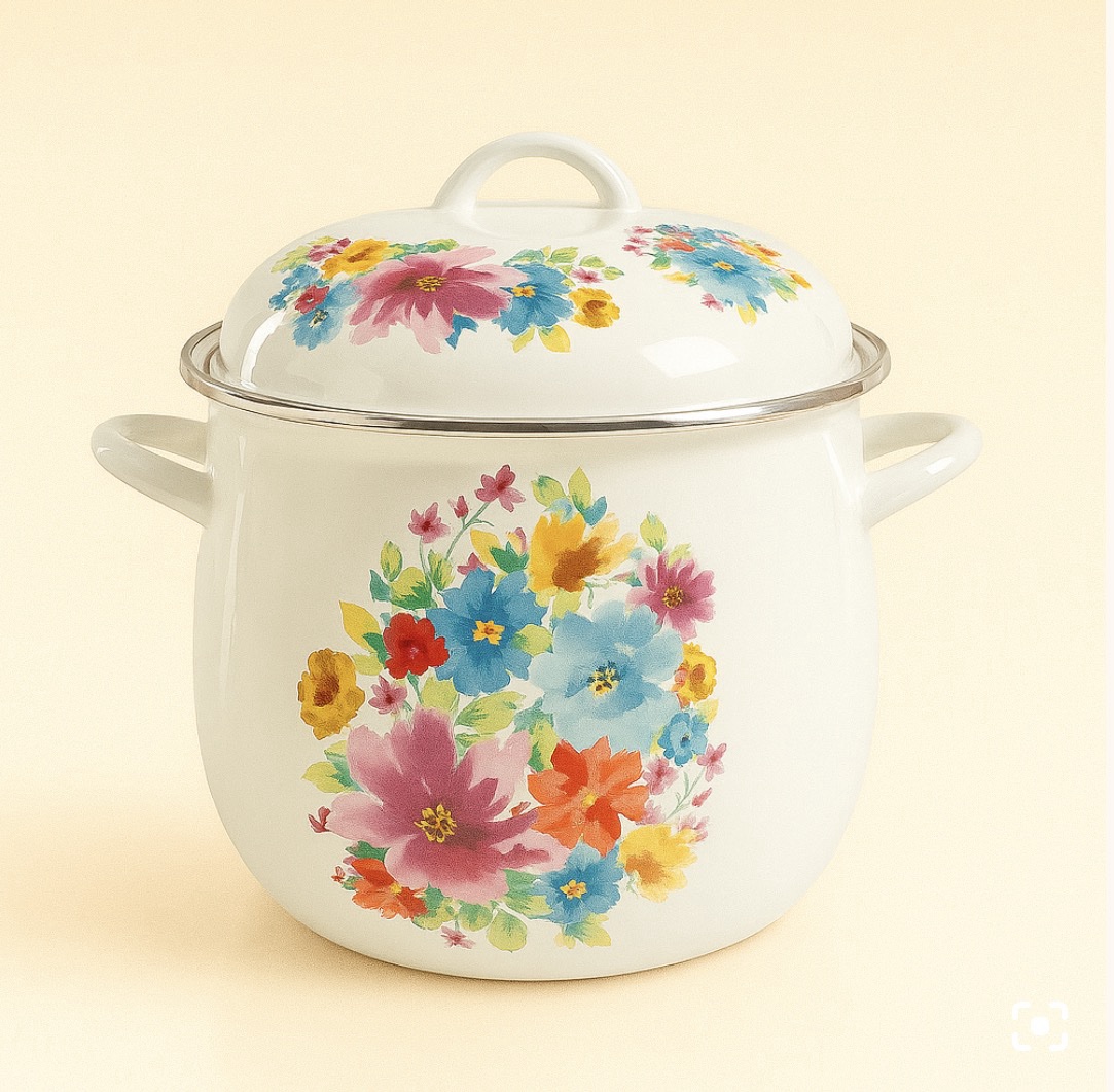 סיר גדול בנפח 12 ליטר, בצבע לבן בעיצוב וינטג’ קלאסי בהשראת הדיזיין הישן המעוטר.