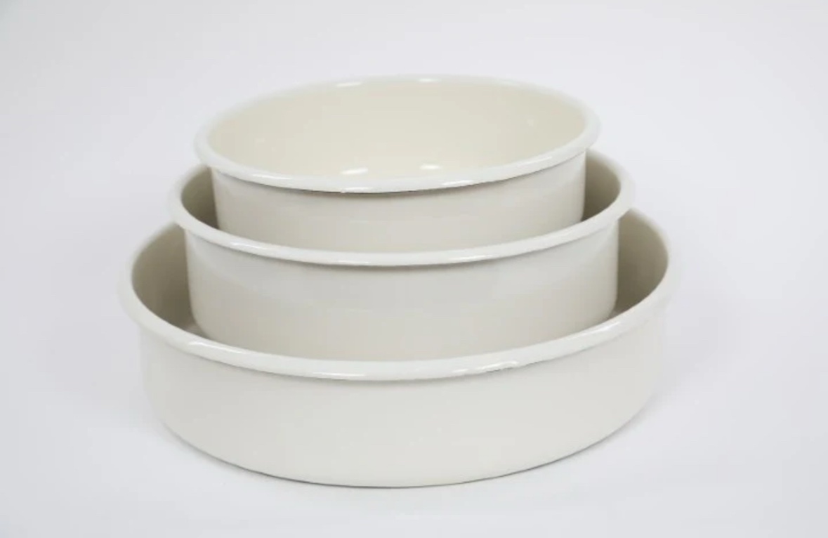 תבניות מתכת של חברת אמייל בצבע לבן – מגיעות בשלושה גדלים. מתאימות לאפייה בתנור, להכנת גלידה, קינוחים וגם לצליית עוף ובשרים. עמידות ואיכותיות לכל שימוש במטבח